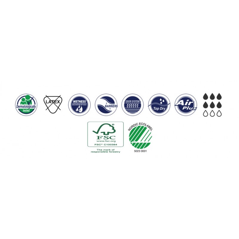 • Produsele dispun de sistemul Top-Dry pentru confort optim si integritate a pielii. Tehnologia de baza eficienta asigura o absorbtie rapida. Combinatia dintre bariere de scurgere (bariere pe lungime si transversale) si elasticitate ofera o protective completa la scurgeri. Sistemul de control al mirosurilor minimizeaza mirosurile neplacute. Indicatorul de umiditate cu scara gradata (cu exceptia marimii XS1) ghideaza utilizatorul si ingrijitorul catre produsul cu nivelul de absorbtie potrivit. Pentru o eliminare discreta, infasurati produsul si fixati-l cu banda Z incorporata in spate.