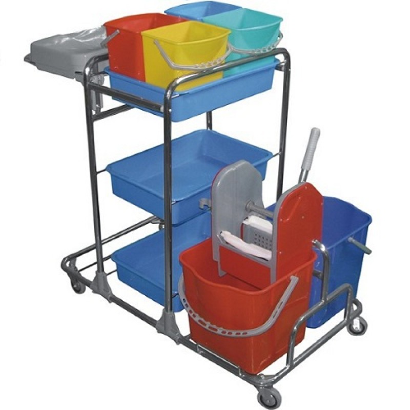 Acest carucior este folosit pentru curatenie in spitale, hoteluri si HoReCa, avand un sistem multifunctional de: suport profesional menajer, sistem de galeti cu storcator profesional si mai multe suporturi pentru orice fel de detergent si ustensile de curatenie.